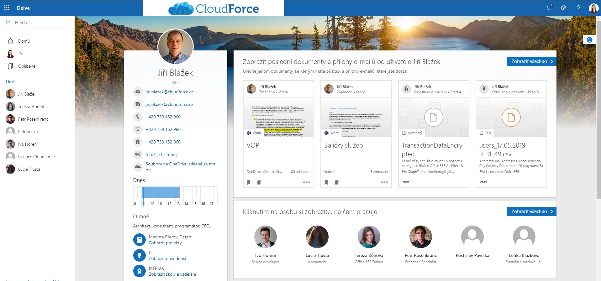 Místo, kde najdete vše, po čem pátráte. Pokud si nemůžete vzpomenout na přesné jméno souboru, nevíte kde je uložený, ale potřebujete ho najít – pomůže vám Delve. Pokud je vás v organizaci hodně, nejste si jisti firemní strukturou, potřebujete kontaktovat kolegu z jiného oddělení, ale nemáte na něj kontakt – pomůže Delve. V případě, že chcete vědět na čem pracují vaši kolegové a jak jsou vytížení – práskne to na ně Delve. Nemusíte se bát, vždy vidíte jen to, co s vámi ostatní sdílí a k čemu máte přístup. Stejně jako v ostatních aplikacích i v Delvu se odráží všechna nastavená práva v rámci prostředí Microsoft 365.